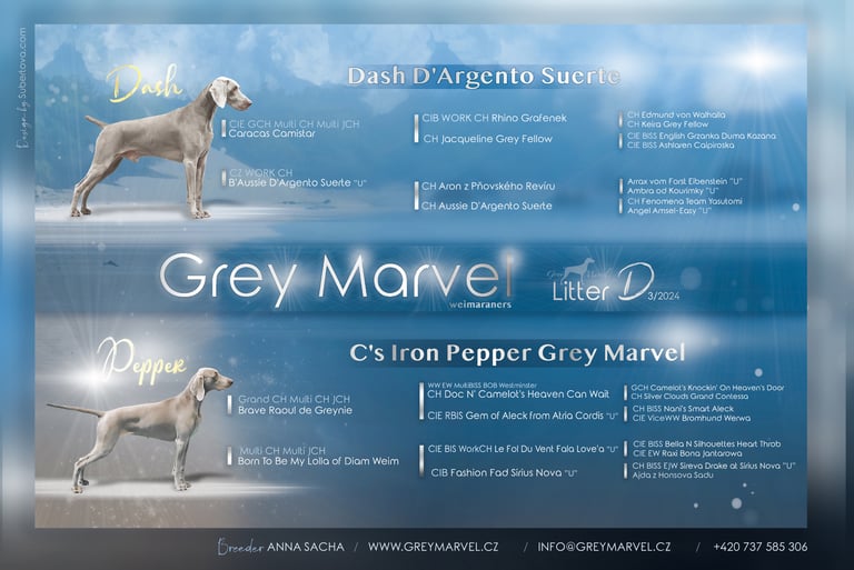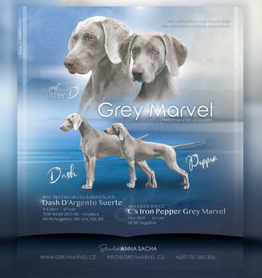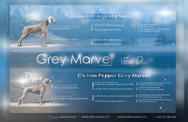 Koncem března 2024 se narodili štěňátka - vrh D. Matka štěňátek je naše Pepper a otec nádherný Dash. Proč jsem zvolila právě toto spojení? Důvod je jednoduchý, Dash je vnuk mého prvního výmarského ohaře Luxora a jako třešnička na dortu má krásný exteriér a povahu. Je to jeden z nejúspěšnější VOK poslední doby, což dokládají výsledky výstavních sezón 2022, 2023 a 2024. Více o něm níže.