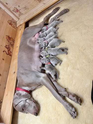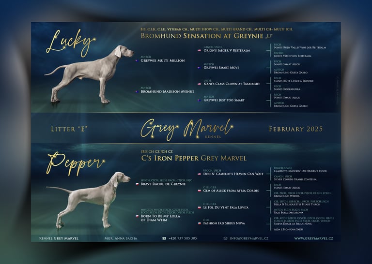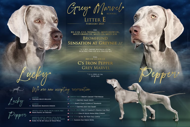 matka vrhu E je naše Pepřenka a otec importovaný pes do ČR z Austrálie v roce 2011. Jedná se o vyjímečné spojení dvou šampionů s perfektním rodokmenem. Krytí proběhlo formou inseminace.